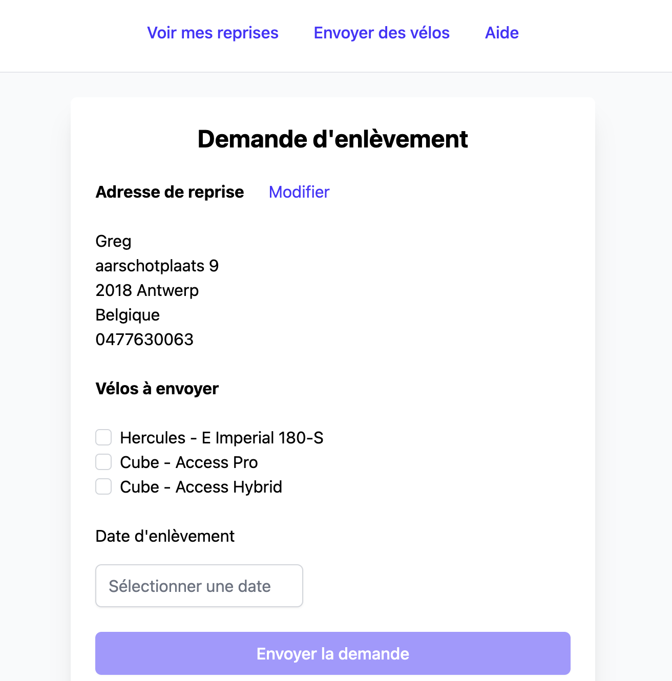 Après avoir téléchargé tous les documents dans votre onglet 'reprise', vous pouvez planifier l'enlèvement du vélo. Sélectionnez une date de votre choix, et notre partenaire My Home Delivery viendra chercher le vélo pendant vos heures d'ouverture.