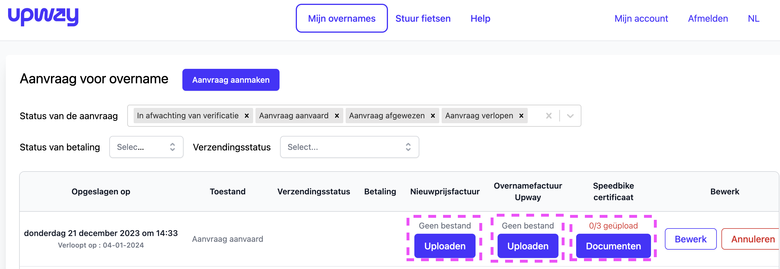 Nadat je overnameverzoek is goedgekeurd, kun je de benodigde documenten (factuur van de nieuwprijs, Upway overnamefactuur, speedbike certificaten) in de tool uploaden.